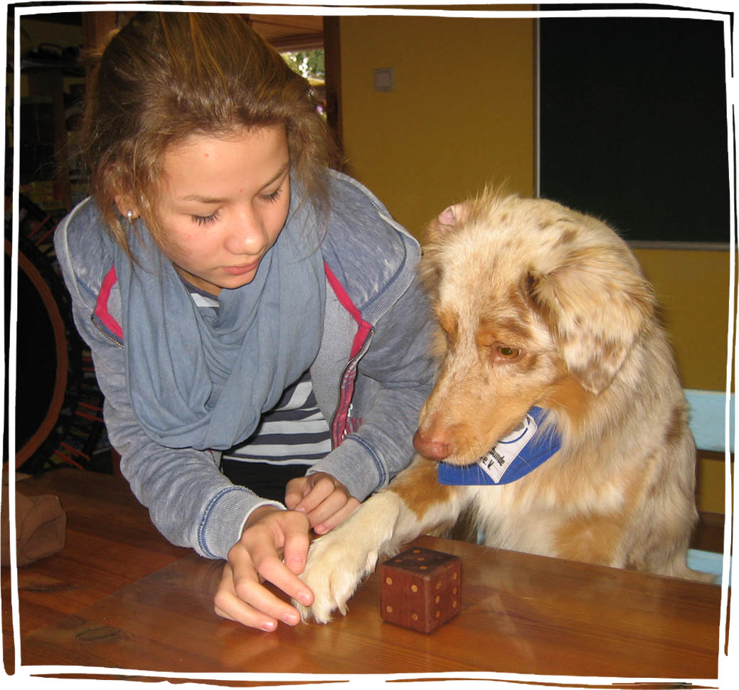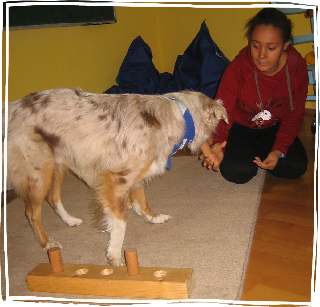Im Vordergrund steht die individuelle Förderung des Kindes/Jugendlichen. Es wird multisensorisch gearbeitet, d.h. mit allen Sinnen, um zu Verhaltensänderungen und Lernerfolgen zu gelangen. Der Pädagogik/Therapiebegleithund als Motivator spielt hier eine große Rolle. Er schafft Sicherheit und Vertrauen zur Situation, zum Therapeuten und zum Schüler selbst. Er weckt die Entdeckerlust, sodass man sich an Neues herantraut. Das Meistern von Neuem schafft und stabilisiert wiederum Kompetenzen im sensomotorisch-perzeptiven, sowie sozio-emotionalen Bereich und führt zur Erweiterung kognitiver/ intellektueller Fähigkeiten, wie z. B. Lernfähigkeit, Merkfähigkeit, Konzentration, Sprachfähigkeit und Rechenfertigkeit. Der Schüler/die Schülerin gelangt durch die Arbeit mit dem Therapiebegleithund zu einem erweiterten Selbstwertgefühl, was sich wiederum positiv auf seine/ihre Lern- und Leistungsbereitschaft auswirkt. So werden auch im Rahmen aktueller schulischer Lerninhalte Defizite aufgearbeitet und eine langfristige Notenverbesserung ermöglicht.